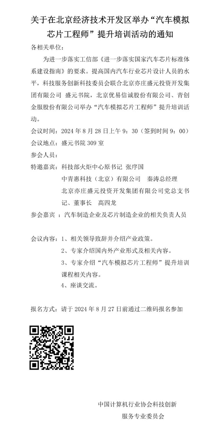 关于在北京经济技术开发区举办“汽车模拟芯片工程师”提升培训活动的通知